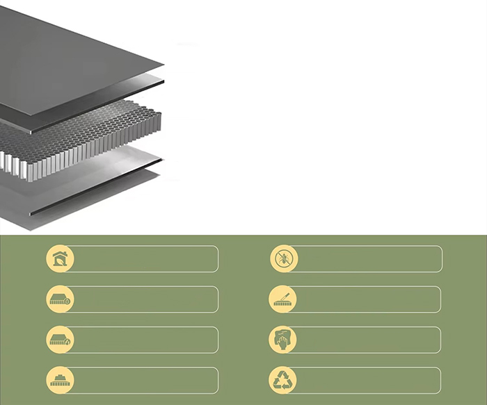 অ্যালুমিনিয়াম মধুচক্র প্রাচীর প্যানেলগুলি উচ্চ-শক্তির অ্যালুমিনিয়াম খাদ প্যানেলগুলির সাথে পৃষ্ঠের স্তর এবং ষড়ভুজাকার অ্যালুমিনিয়াম মধুচক্রের মূল উপাদানগুলি ভিতরে এমবেড করা সমন্বিত প্যানেল। মধুচক্রের মূল কাঠামোটি আঠালোর মাধ্যমে প্যানেলের সাথে শক্তভাবে একত্রিত করা হয় যাতে একটি হালকা ওজনের এবং উচ্চ-দৃঢ়তা সম্পূর্ণ হয়। পৃষ্ঠটি ফ্লুরোকার্বন বা কাঠের শস্য স্থানান্তর প্রযুক্তি দিয়ে স্প্রে করা হয়, যা প্রাকৃতিক টেক্সচারের সাথে ধাতব টেক্সচারকে একত্রিত করে, এতে সুপার জারা প্রতিরোধের, তাপ নিরোধক, শব্দ নিরোধক এবং প্রভাব প্রতিরোধ ক্ষমতা রয়েছে এবং এটি অভ্যন্তরীণ এবং বহিরঙ্গন সজ্জা, পর্দার দেয়াল, সিলিং এবং অন্যান্য দৃশ্যের জন্য উপযুক্ত। ঐতিহ্যগত অ্যালুমিনিয়াম প্যানেল, পাথর এবং কাঠ প্রতিস্থাপন করার জন্য এটি একটি উচ্চ-কার্যক্ষমতাসম্পন্ন উপাদান।