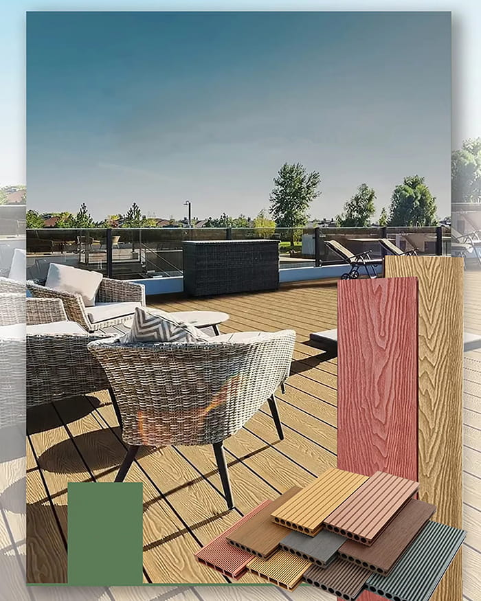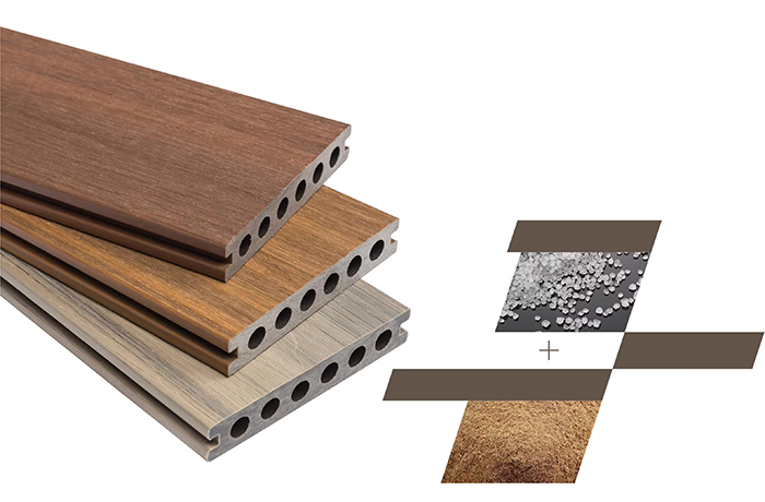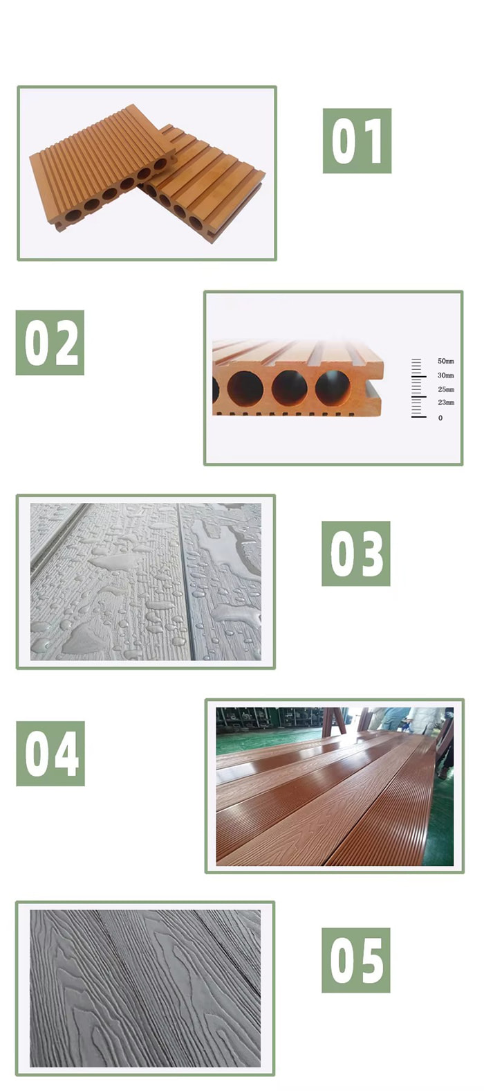 উপাদান: কাঠের ফাইবার এবং থার্মোপ্লাস্টিকের সংমিশ্রণ (যেমন পলিথিন বা পলিভিনাইল ক্লোরাইড)